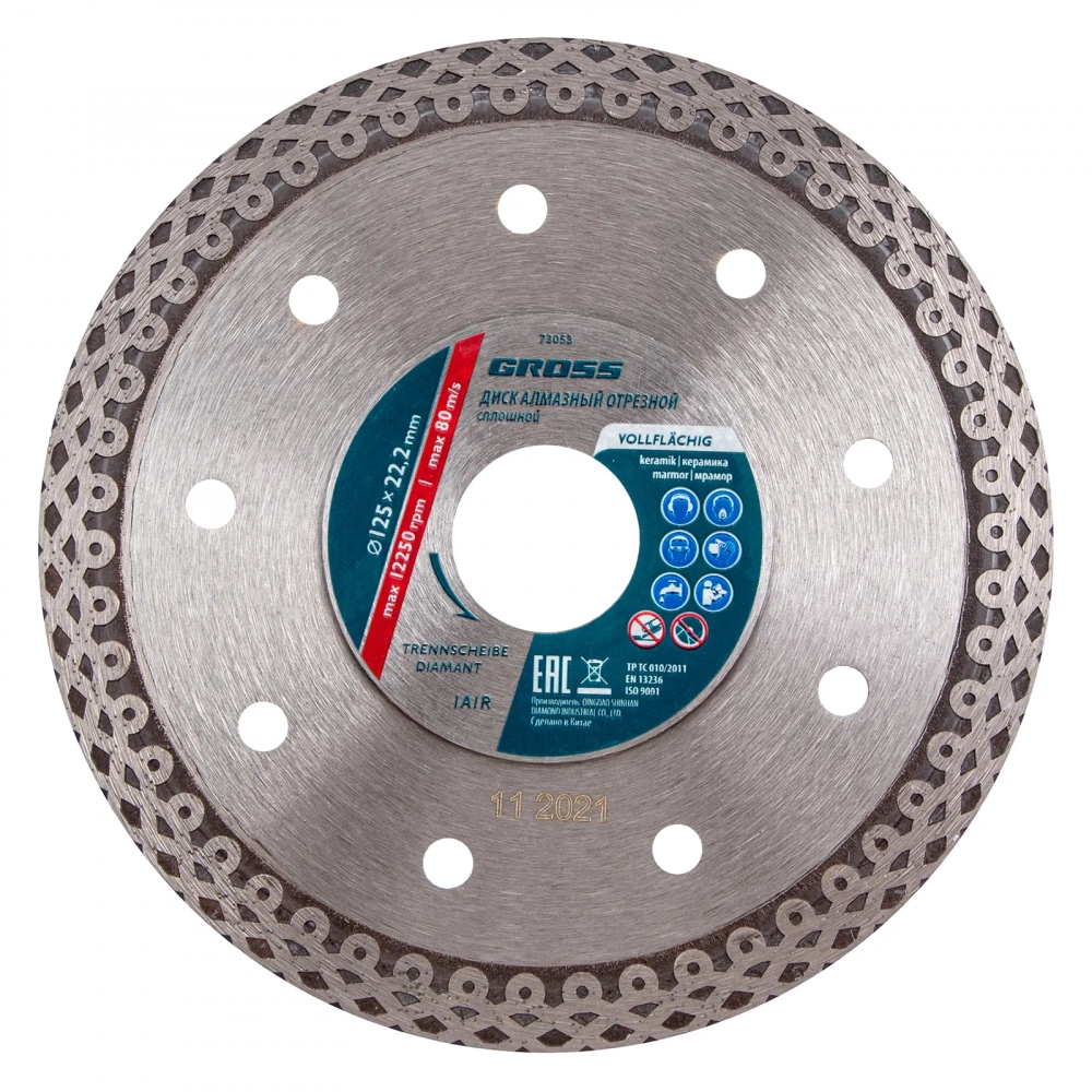 Тонкий сплошной алмазный диск Gross Jaguar ф125 х 22,2 мм, подходит для профессионального мокрого резания с помощью УШМ или плиткореза соответствующего типоразмера. Используется для резки мокрым методом твердых материалов: гранита, керамогранита, плитки, мрамора и камня. Диск оставляет ровный срез без трещин и сколов за счет сплошной формы. При мокрой резке вода охлаждает диск и удаляет пыль с рабочей зоны, поэтому он легко справляется с большими объемами работ. За счет небольшой толщины диска 1,2 мм значительно увеличивается скорость реза.