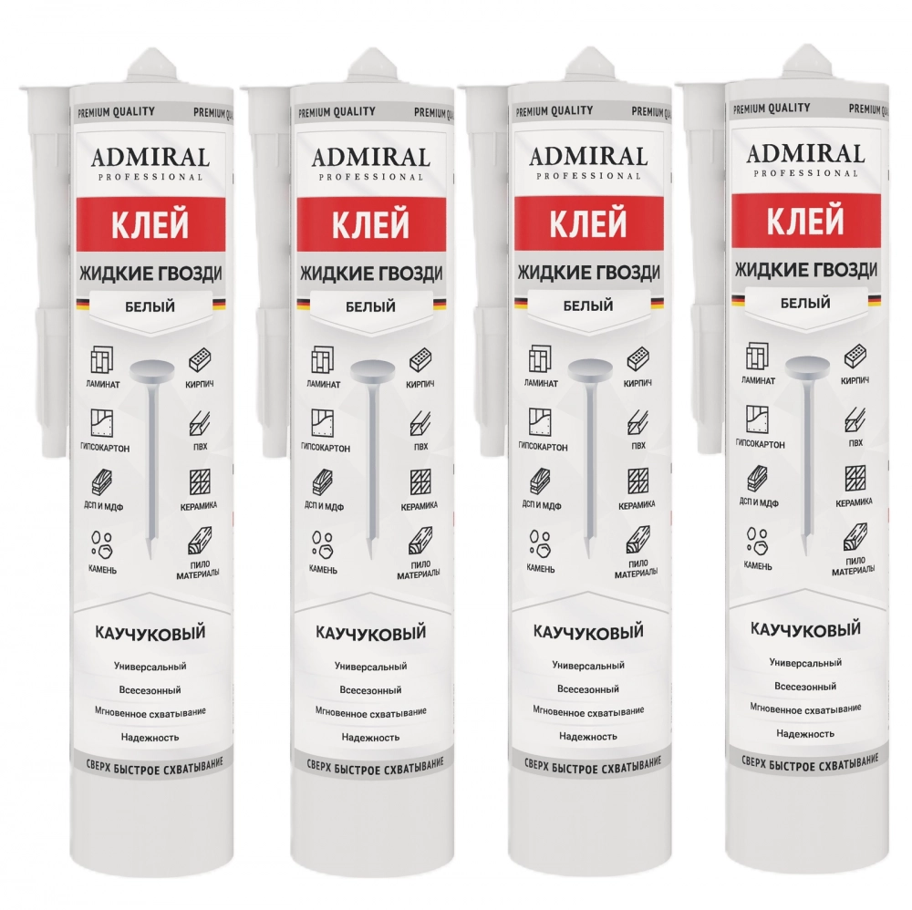 Высококачественный однокомпонентный универсальный сверхпрочный клей «жидкие гвозди» ADMIRAL на каучуковой основе специально разработан для приклеивания тяжелых конструкций из металла, древесины, ДСП, ДВП, различных видов пластика на бетонные, кирпичные, каменные, металлические, деревянные и другие поверхности.