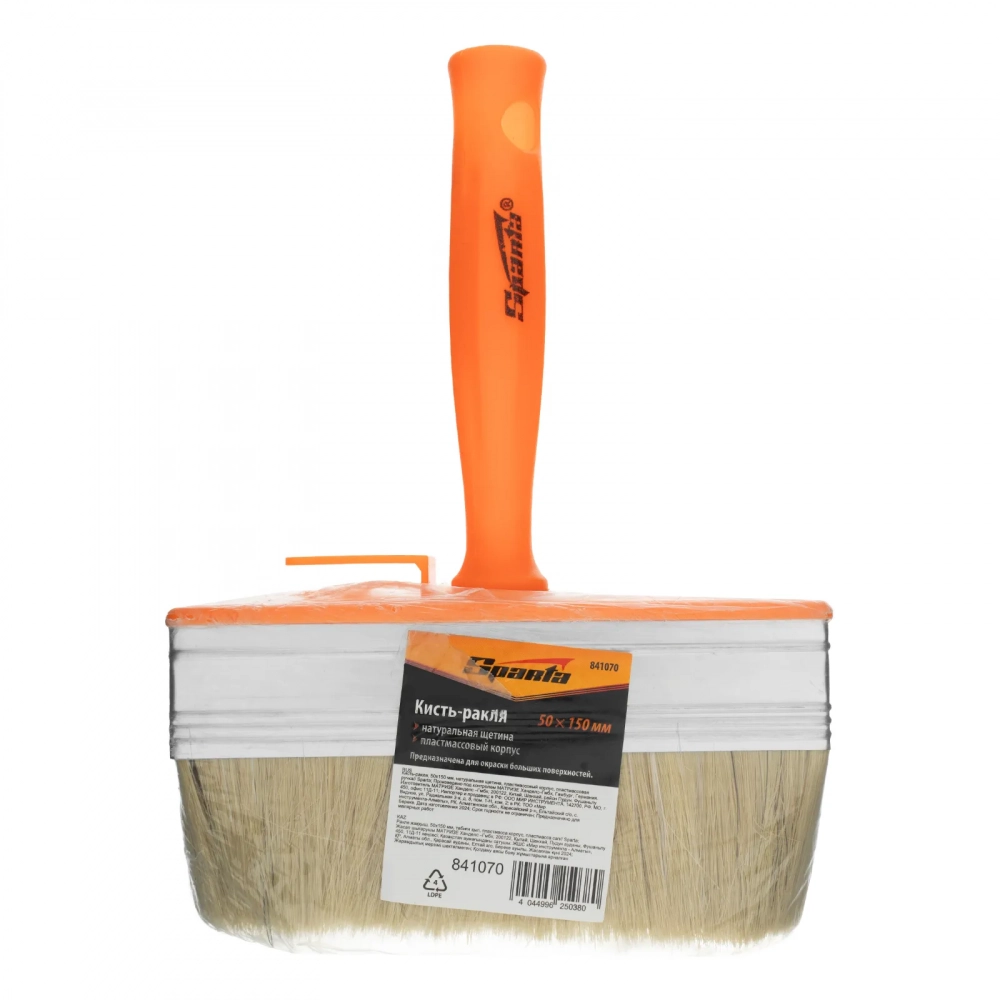 Кисть-ракля Sparta толщиной 50 мм и шириной 150 мм, с натуральной щетиной, пластмассовыми корпусом и ручкой, используется для малярных работ на участках большой площади, поэтому удобна для обработки стен, потолков и фасадов. Натуральная щетина устойчива к химическому воздействию, поэтому не деформируется и сохраняет упругость при работе с ЛКМ на водной основе, грунтовками, масляными красками и клеящими составами.