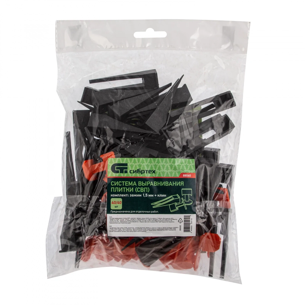 Система выравнивания плитки (СВП) Сибртех включает 40 клиньев и 40 зажимов.